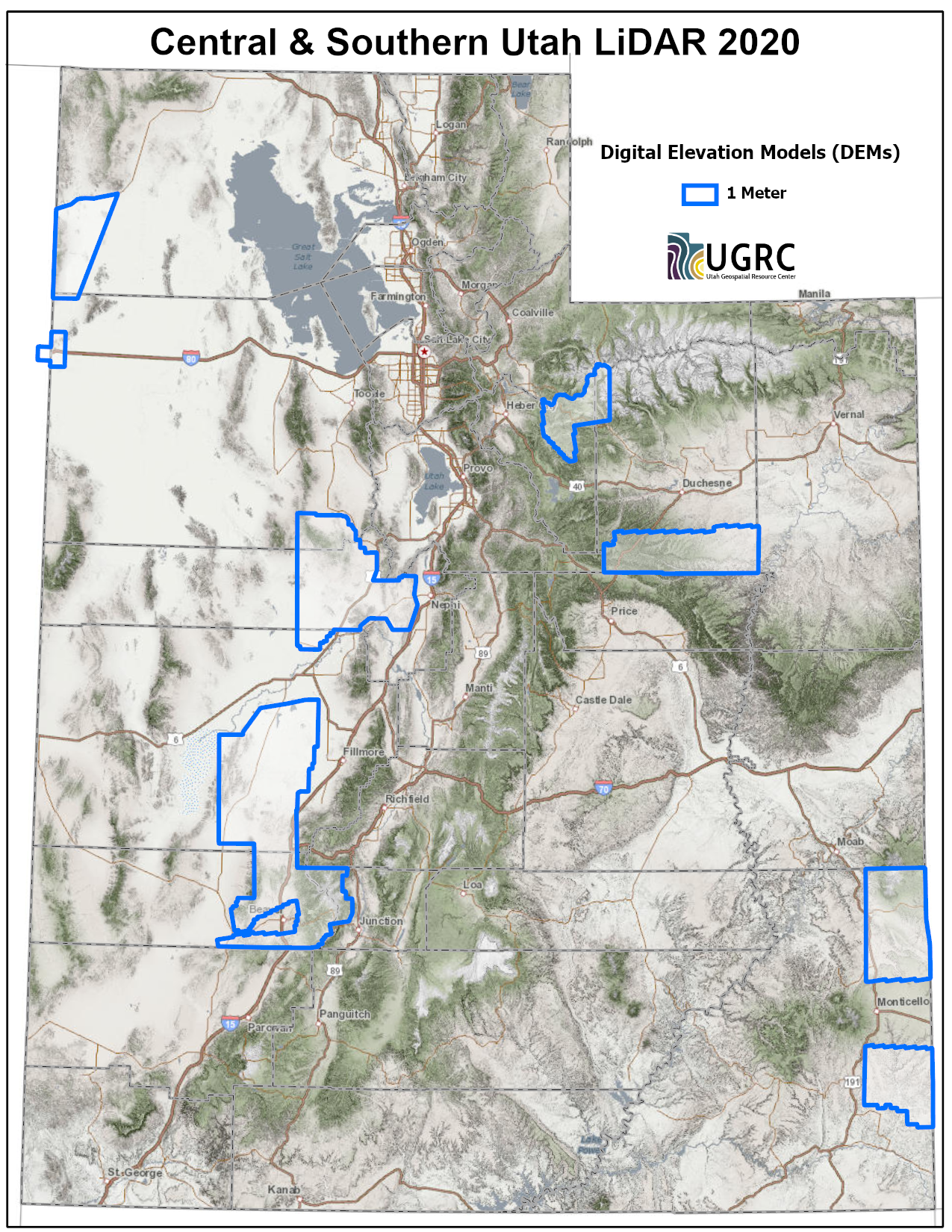 During 2011 UGRC and Utah Geological Survey (UGS) acquired ~1,870 square miles of .85 meter Lidar for areas including the north, east, and south sides of the Great Salt Lake, Cedar Valley, Hurricane Fault, and more. The 1 meter bare-earth DEMs in .img format are available for download. The DSMs and LAS classified point clouds are available from Open Topography , opens in a new tab .