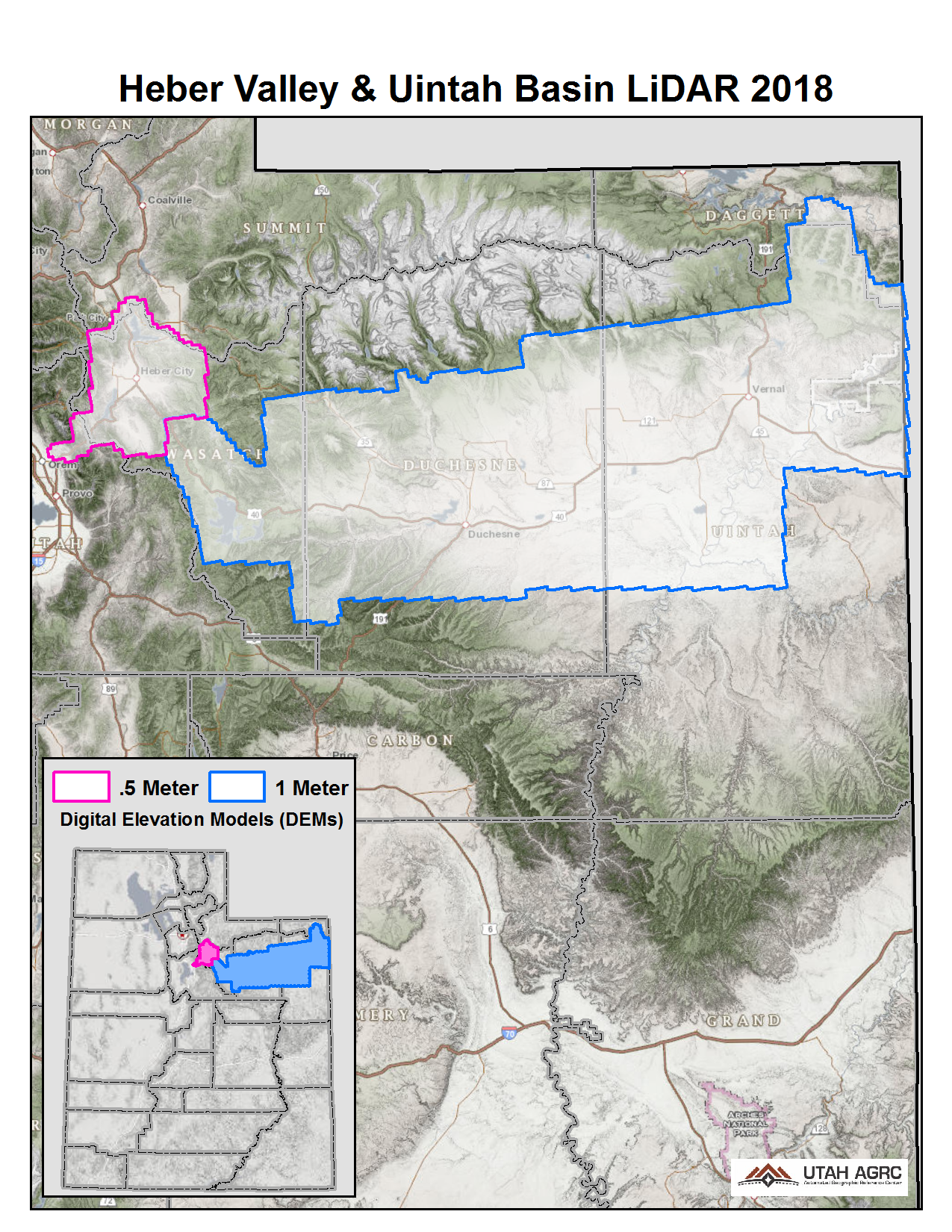 During 2018 the Federal Emergency Management Agency (FEMA) acquired ~4,693 square miles of 2 and 8 points per meter Quality Level 1 & 2 Lidar for areas in Northern Utah that include the Uintah Basin (QL2) and Heber Valley (QL1). The 0.5 and 1 meter resolution bare earth DEMs in .img format have a 10.0cm vertical RMSE accuracy and are available for download. The LAS point clouds are available from The National Map , opens in a new tab . This elevation data was collected between June and October, 2018.