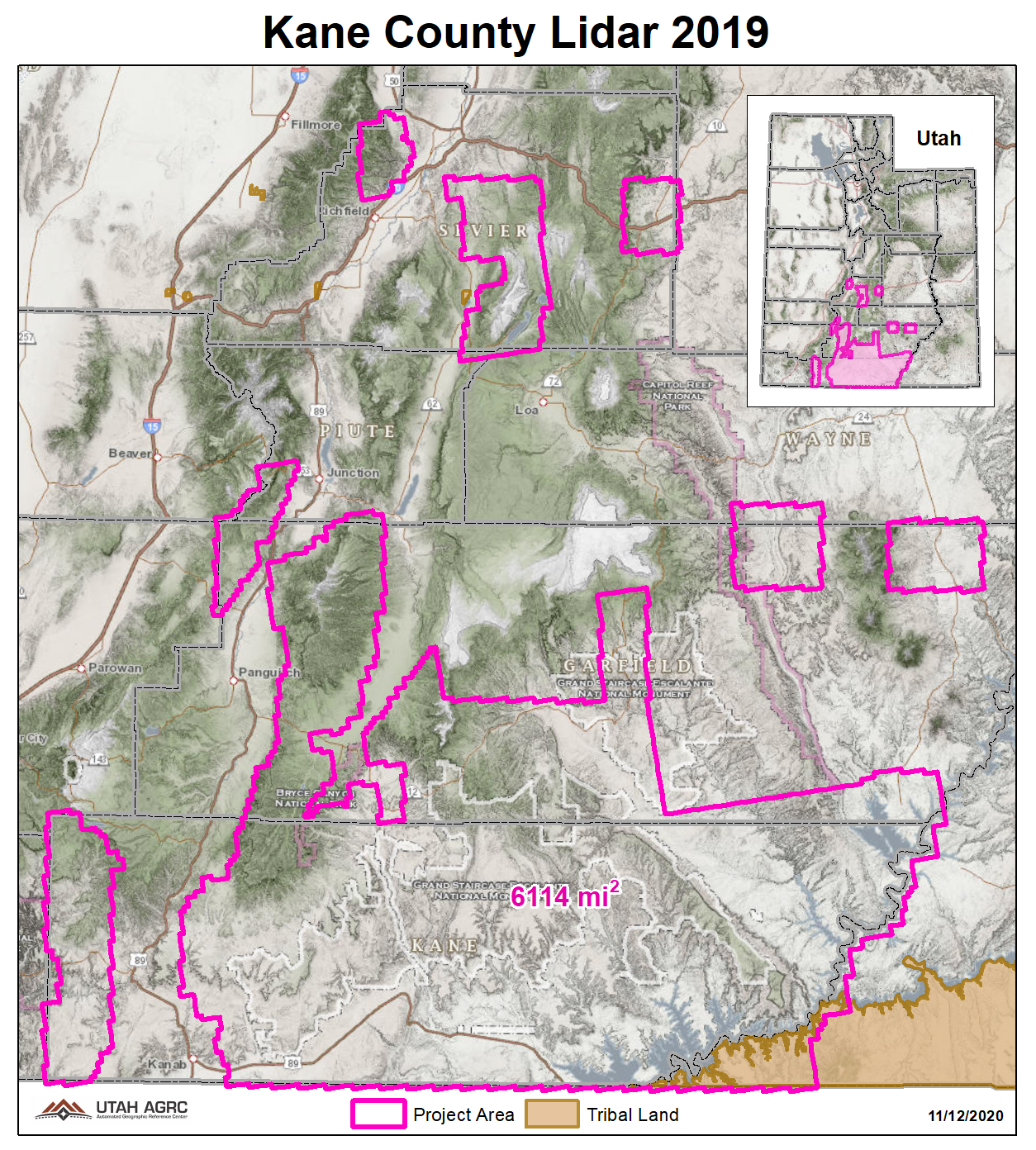 During 2019 UGRC and the Utah Division of Emergency Management acquired ~6,114 square miles of 2 points per meter Quality Level 2 Lidar of Kane County and portions of the Greater Sevier Watershed. The 1 meter resolution bare earth DEMs and first-return/highest-hit DSMs in .tif format have a 10.0cm vertical RMSE accuracy and are available for download. The LAS point clouds are available from The National Map , opens in a new tab .